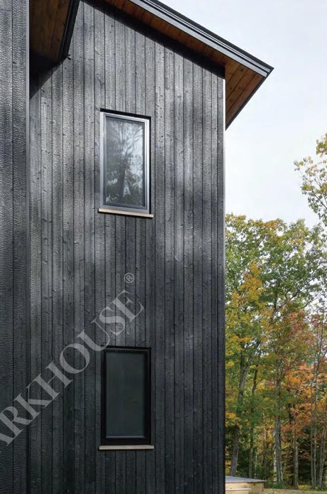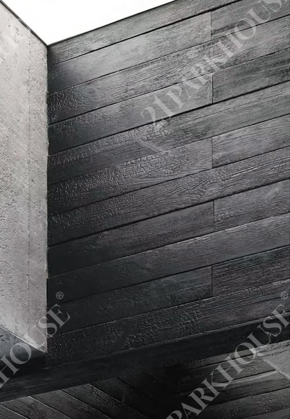 This material is a favorite for modern architectural facades, particularly for private villas and cultural buildings situated in nature. The deep black finish allows the structure to recede visually, creating a striking silhouette that contrasts beautifully with green landscapes or snowy environments. It gives buildings a timeless, weathered appearance that feels grounded and permanent, making it an excellent choice for exterior cladding that requires both durability and strong design character.