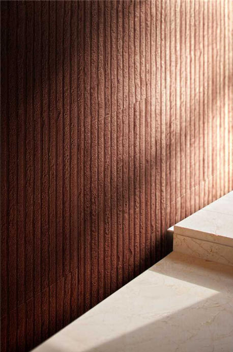 This flexible stone's texture mirrors layered sedimentary rock veins: delicate, low-profile horizontal ridges (subtly raised with a matte, mineral-like grit) define its surface, paired with soft tonal transitions. Faint, natural irregularities (echoing geological mineral deposits) soften the ridges, while the texture balances organic subtlety and structural rhythm: it feels tactile yet refined, with enough flexibility to contour to curved surfaces without losing the quiet, layered character of natural rock veins.
